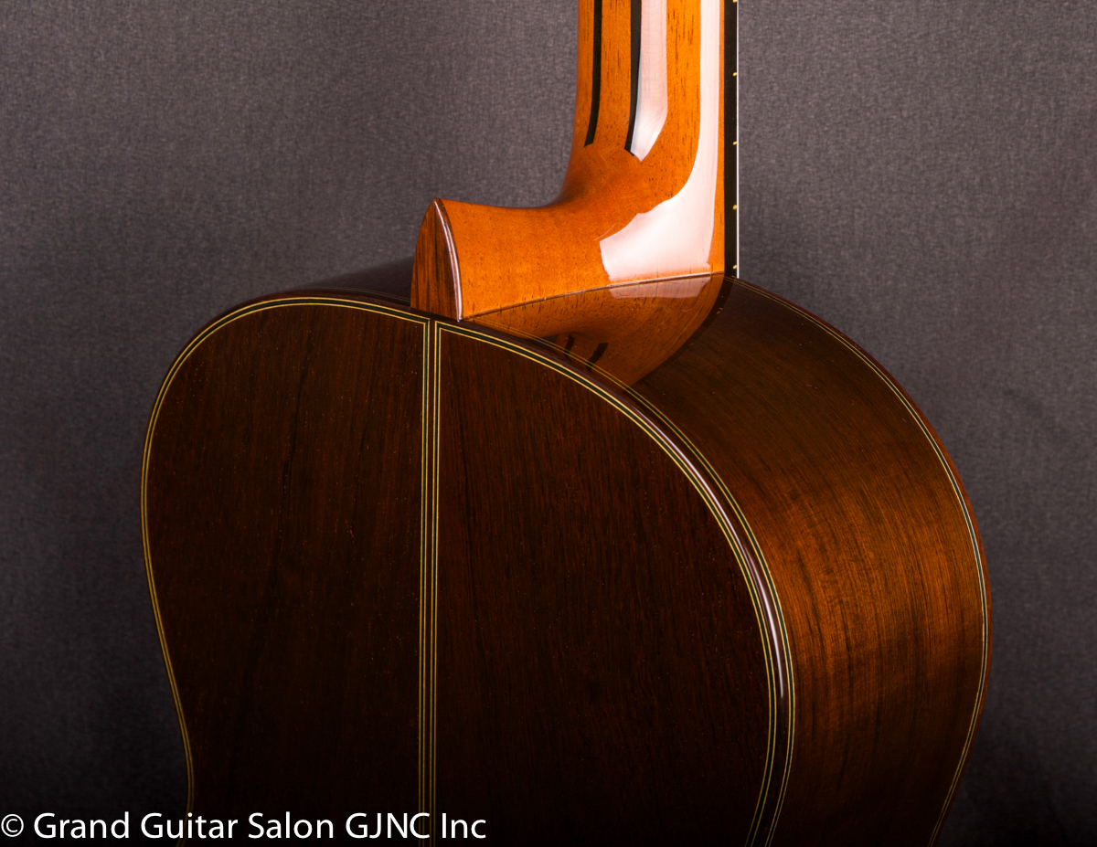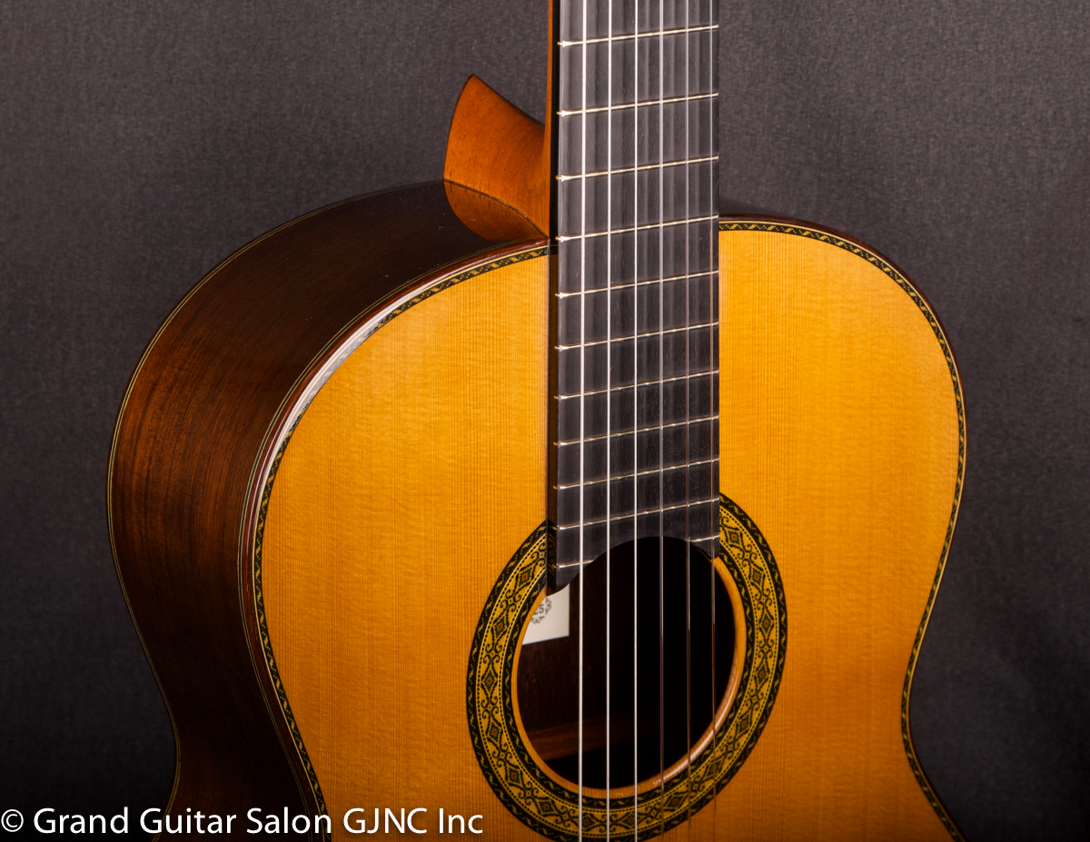 Ce superbe modèle « Spécial » est reconnaissable à son chevalet asymétrique et à sa tête sculptée. Il met en valeur l’esthétique, la marqueterie, les détails de sculpture et la sonorité exceptionnelle des guitares Kohno.